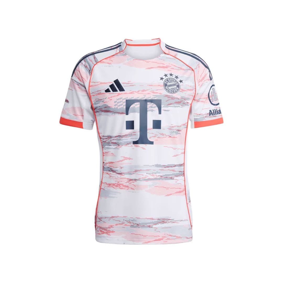 Celebrate 20 years of the Allianz Arena with this FC Bayern Munich Away Jersey 2025-26. Features a stunning white base with coral and grey camouflage patterns inspired by the stadium’s iconic illuminated façade. Built with Adidas HEAT.RDY and AEROREADY moisture-wicking technology for maximum performance. Made from 100% recycled polyester with embroidered crest, five gold championship stars, and special Allianz Arena anniversary icon on the back collar. Perfect for match days and casual wear.