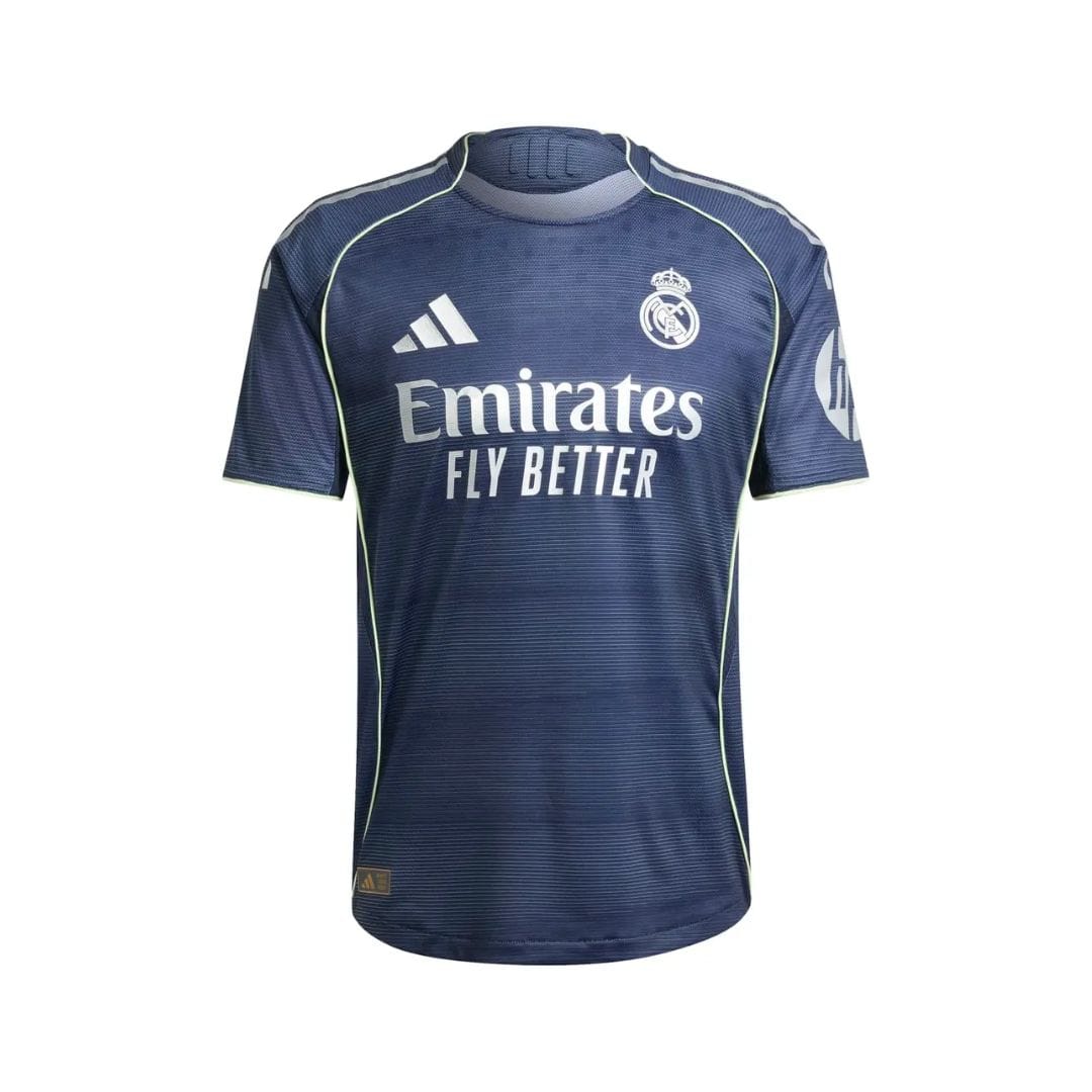 Take to the field like the professionals with the Real Madrid 2025-26 Away Authentic Jersey — the genuine match-worn version of the shirt worn by first-team stars during the campaign. With a striking Legend Ink (deep navy) base color, this kit pays homage to the modernised Santiago Bernabéu stadium’s exterior lighting and architecture through a subtle moiré print and silver metallic badge details.